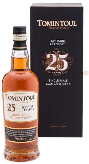 Multi-award winnende Tomintoul Speyside Glenlivet Single Malt Scotch Whisky Aged 25 Years is liefdevol vervaardigd, uit een selectie van de beste bourbonvaten, elk met een leeftijd van ten minste vijfentwintig jaar.
