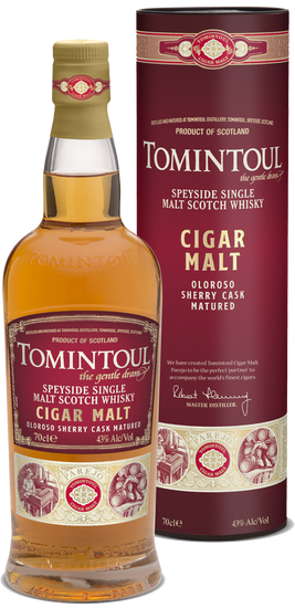 Een prachtig uitgebalanceerde Oloroso sherryvat gerijpte Tomintoul, die rijk, complex en vol van smaak is. De neus is vet en uitgesproken met aroma's van gedroogd fruit, zoete kruiden, pecannotentaart en subtiele turfrook. Het gehemelte is zoet en rijk aan lagen chocolade rozijnen, boter toffees en braamstruiken vermengd met zwarte peper en rokerige houtachtige kruiden. De afdronk is warm en lang met tonen van mokka, ahornstroop en geroosterde eik die op de tong blijft hangen.