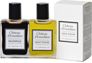 Mini pack compose d'un vinaigre balsamique (15ml) et d'une huile d'olive vierge extra (15ml).